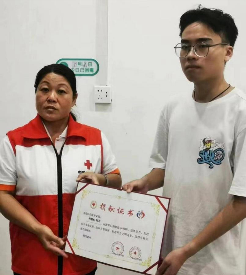▲何繼東兒子何貴蔚(右1)從百色市紅十字會工作人員手上接過捐獻證書
