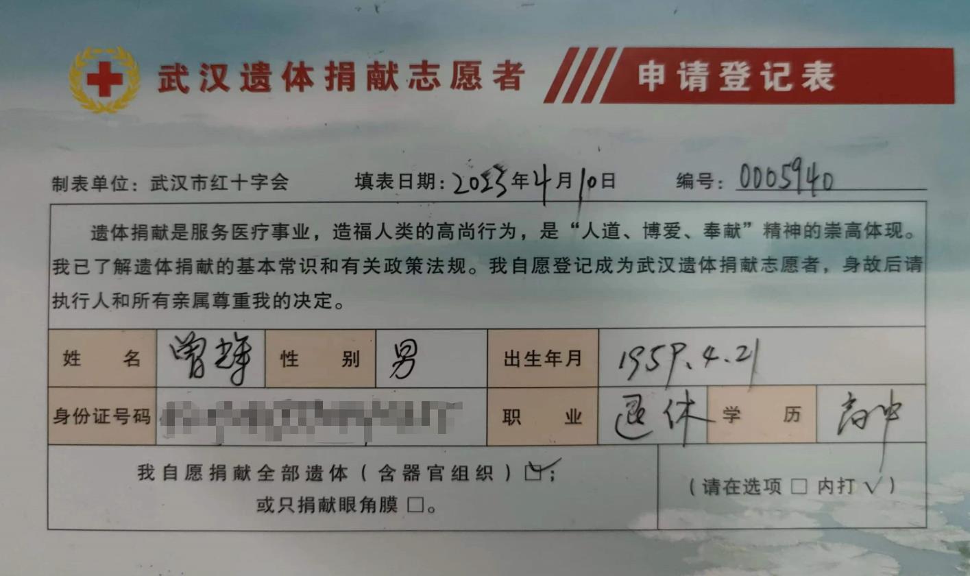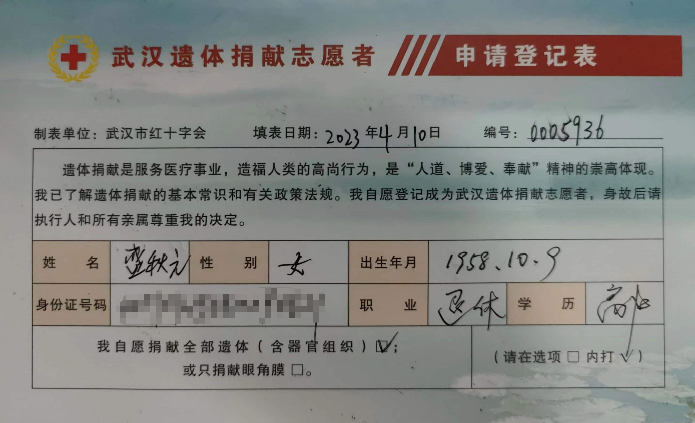家住漢陽的曾輝、盛秋元夫婦是武漢某公交公司的退休人員。3月26日是武漢市第17個遺體器官捐獻者紀念日,當日夫妻倆在看電視的時候,看到有市民朋友進行遺體器官捐獻登記。他們認為,不僅百年之后能幫助更多人,還能給子女減輕負擔,便萌生了夫妻雙方遺體捐獻的想法。夫妻倆有一個親戚也是一名遺體捐獻志愿者,在詢問相關細節(jié)后,夫妻倆一拍即合,決定馬上將想法付諸行動。